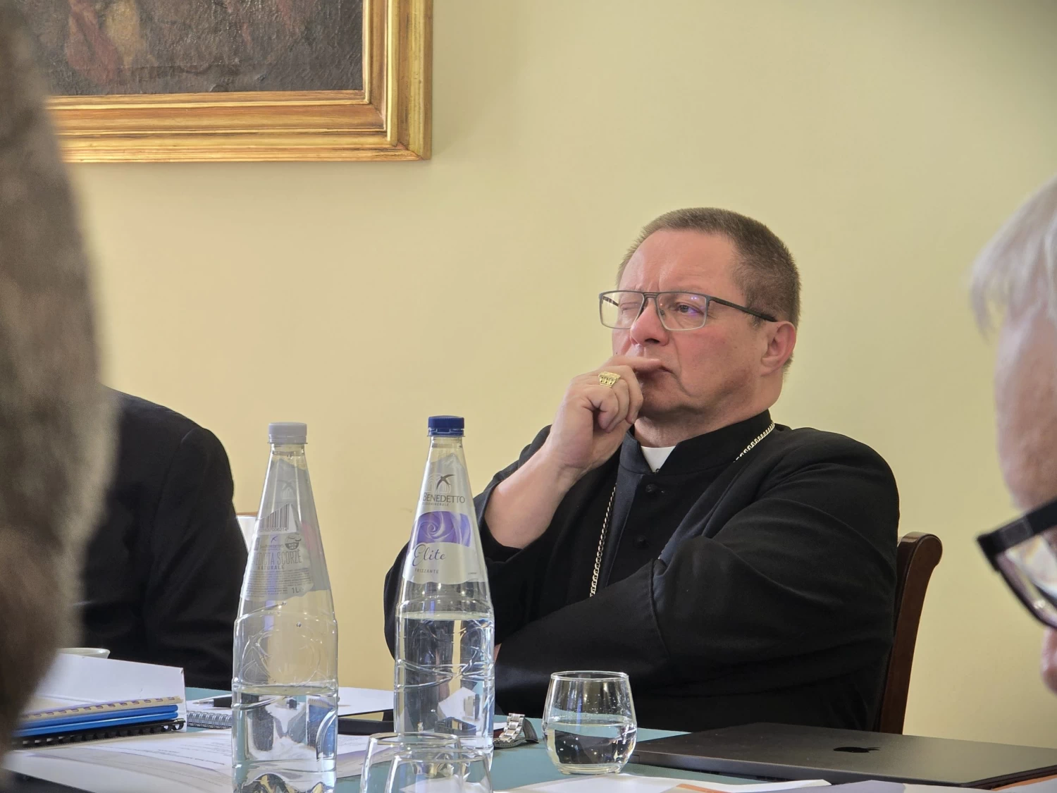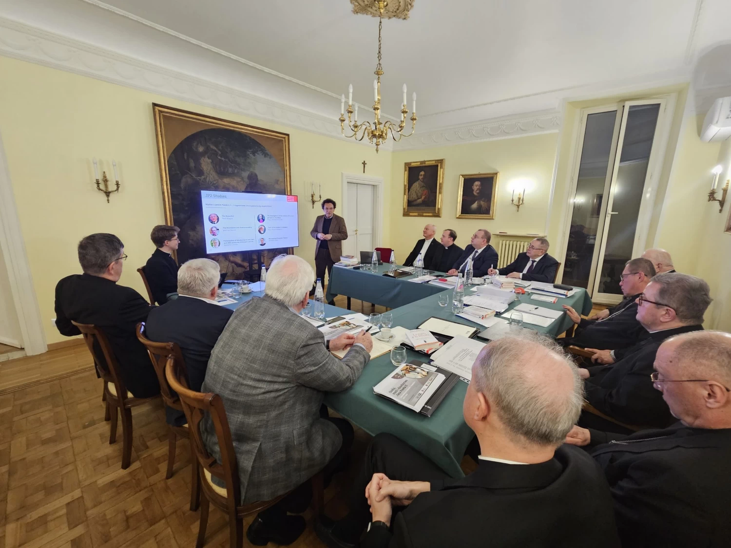 La première journée s’est conclue par les interventions des représentants des institutions partenaires. Le premier à prendre la parole fut le P. Prof. Mirosław Kalinowski, recteur de l’Université Catholique de Lublin, où la Fondation mène depuis plusieurs décennies son programme de bourses. Le recteur a présenté les réalisations du KUL dans la promotion scientifique et médiatique de l’enseignement de saint Jean‑Paul II, ainsi que les résultats d’une étude sur la religiosité des jeunes. Ensuite, le Conseil a rencontré le Dr Dariusz Karłowicz, fondateur et directeur du programme de l’Institut de Culture Jean‑Paul II à l’Université Angelicum de Rome (alma mater de Jean‑Paul II et de Léon XIV), et par ailleurs président de la Fondation Saint‑Nicolas. La Fondation Vaticane Jean‑Paul II et l’Institut de Culture Jean‑Paul II à Rome sont aujourd’hui deux partenaires stratégiques très proches, réalisant ensemble de nombreux projets importants, tels que les études JP2 Studies à l’Angelicum, les Journées Jean‑Paul II dans les universités pontificales de Rome, le cycle pictural Peindre le catholicisme à nouveau, béni par Léon XIV l’an dernier, ou encore les randonnées de montagne pour étudiants.