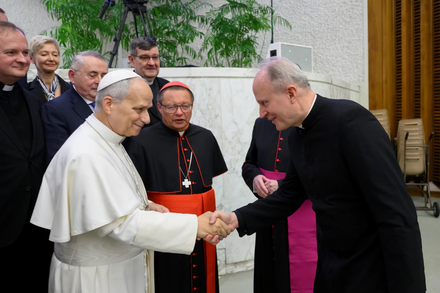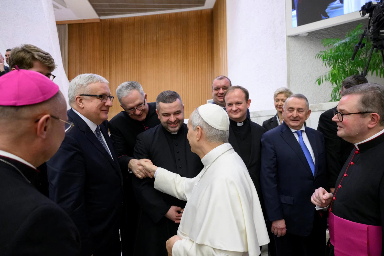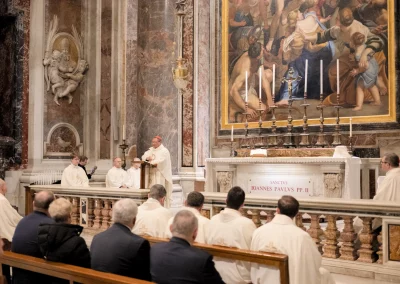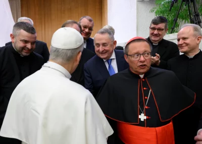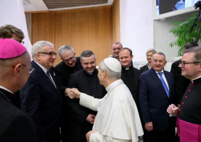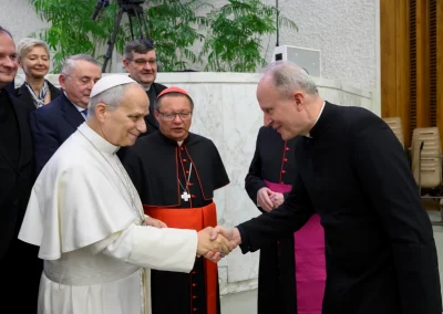 La rencontre a débuté le 11 février par une Eucharistie célébrée sur la tombe de saint Jean‑Paul II au Vatican, présidée par le cardinal Ryś. Parmi les concélébrants figuraient notamment le cardinal Dziwisz, Mgr Oder, des prêtres liés à la Fondation ainsi que les recteurs de l’Université Catholique de Lublin (KUL) et de l’Université Pontificale Jean‑Paul II (UPJP2), avec lesquelles la Fondation collabore depuis des années. Assistaient également à la messe les membres du Conseil, les employés et amis de la Fondation, ainsi que les Sœurs Servantes du Sacré‑Cœur associées à ses activités à Rome. Ensuite, lors de l’audience générale dans la Salle Paul VI, les participants ont rencontré personnellement le Saint‑Père Léon XIV, qui a exprimé sa gratitude pour les actions de la Fondation et a béni sa mission future.